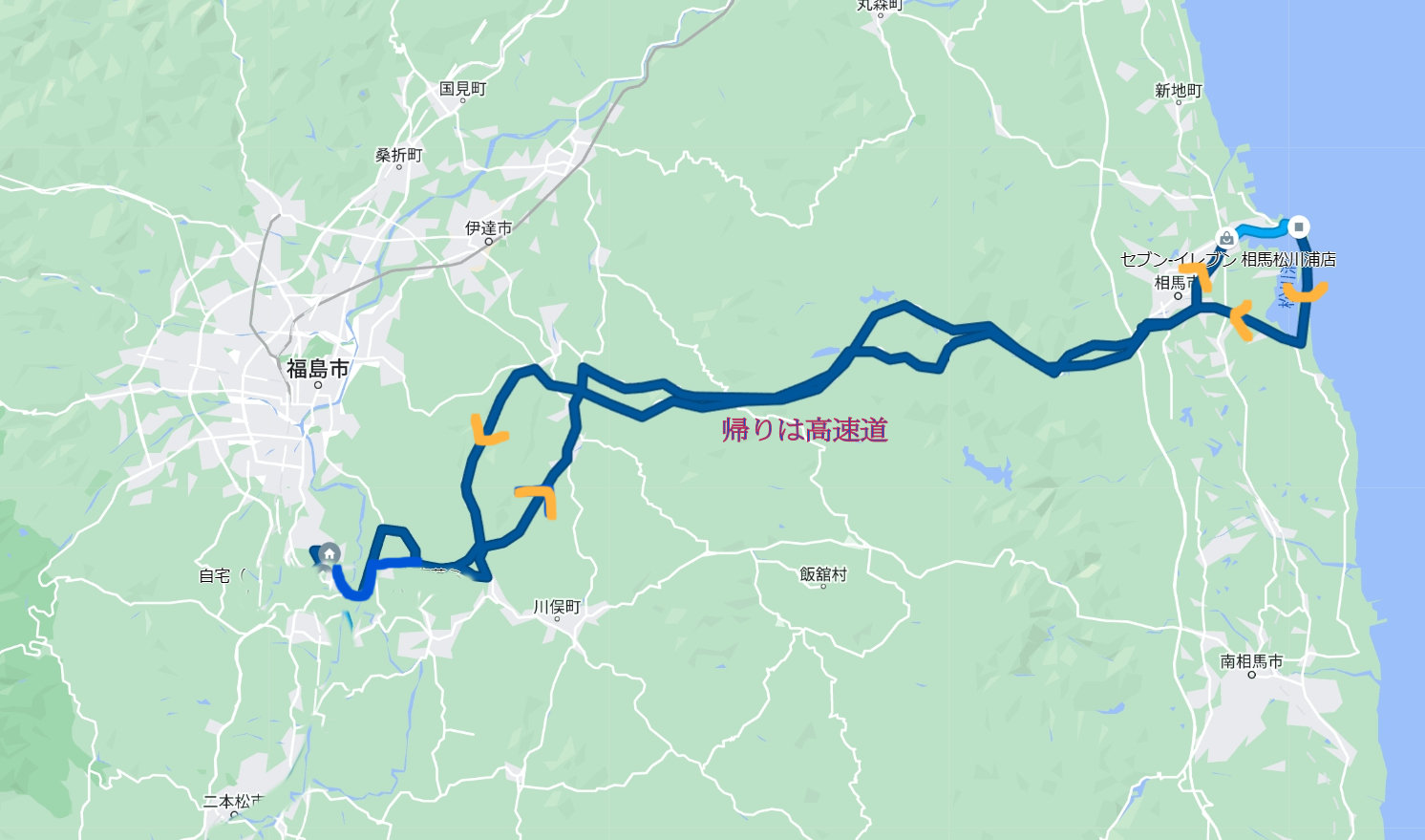 まずは霊山子供の村を目指しました。3つのナビ、時に別方向案内することもありますが、音声案内も聞こえて、まあ目指す目的は達したようです。ちょっと時間的な余裕もあり、松川浦に目的地を変えました。行きは国道115号下道で、ワィンディングを楽しみました。